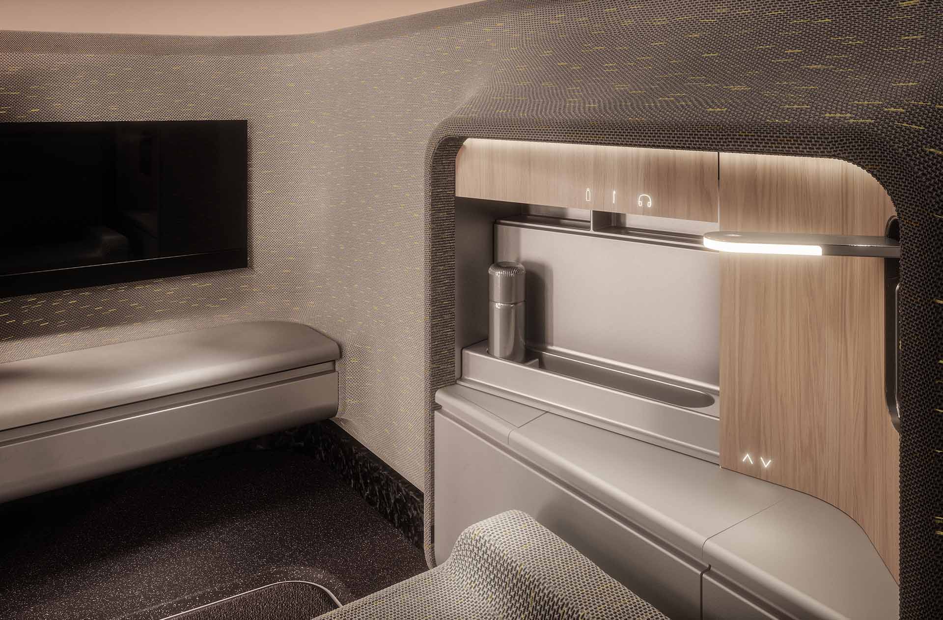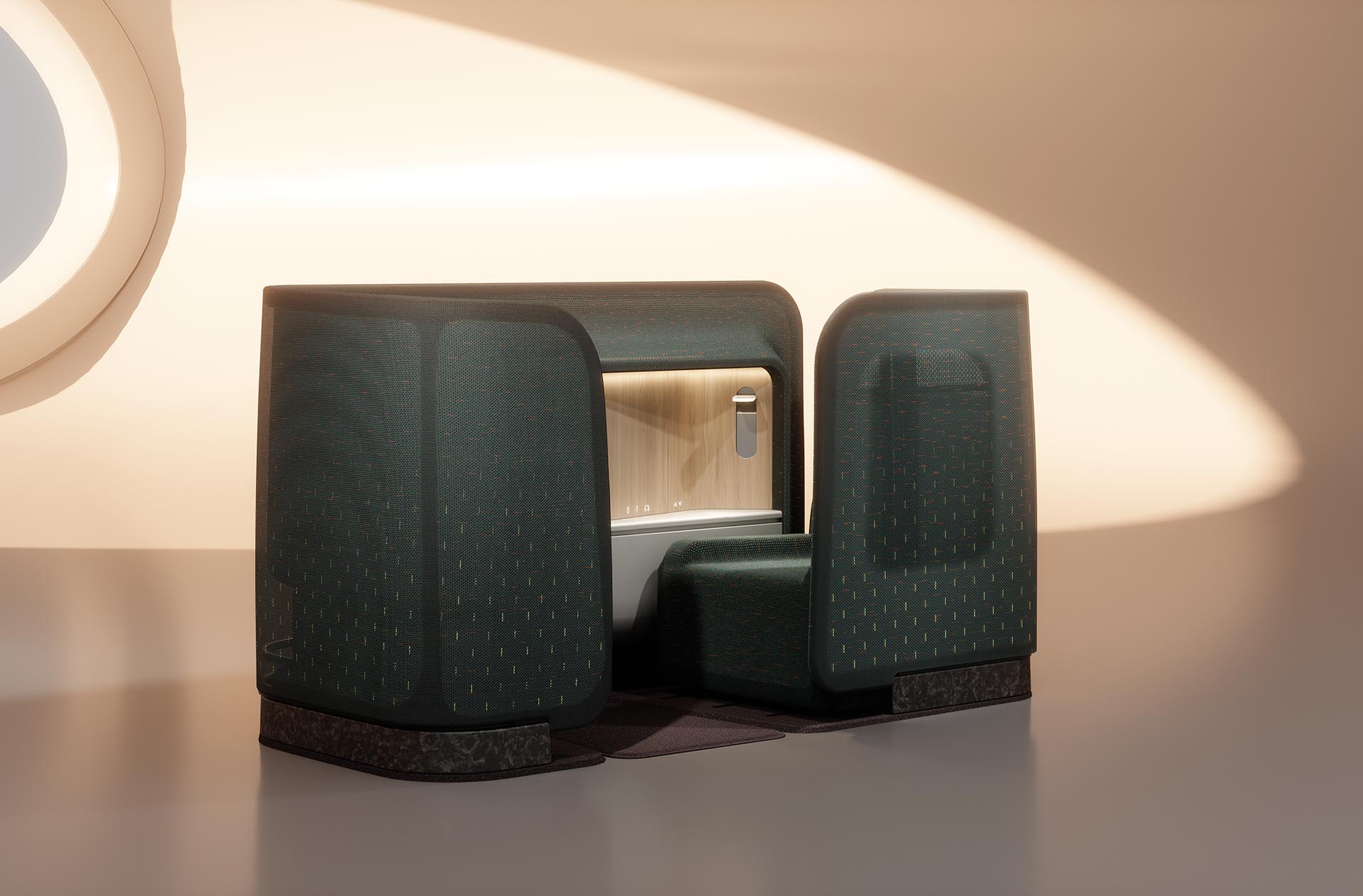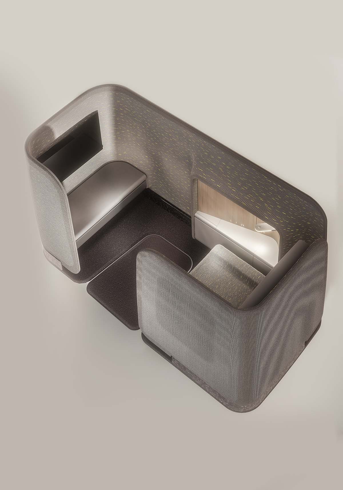 The 3D-knitted membrane integrates carbon and elastic polymers, granting it controlled flexibility and allowing the seat to transition smoothly from an open state to a private enclosure.
